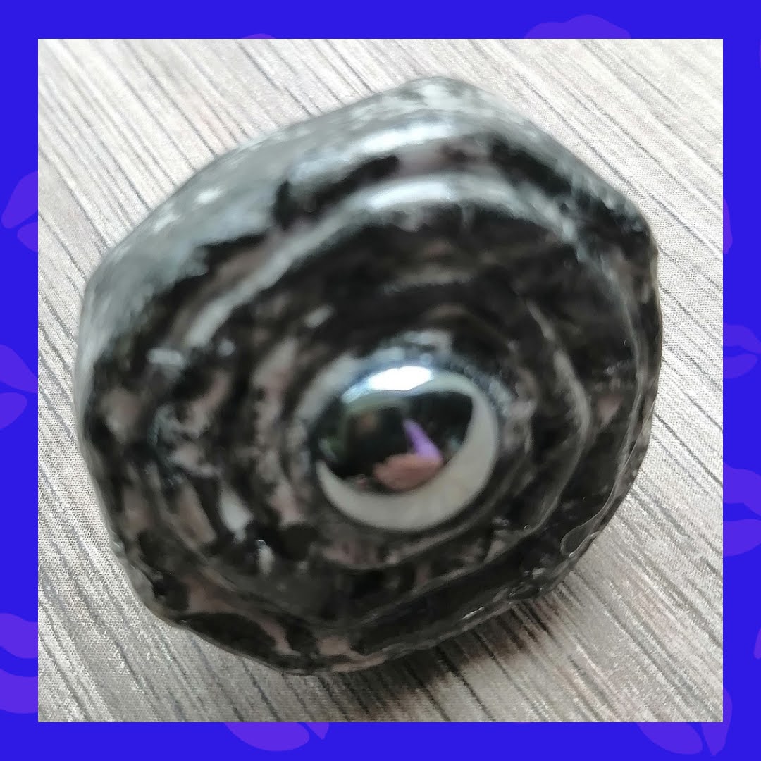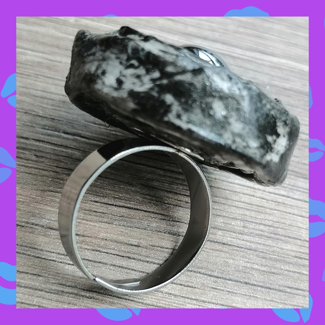 Anillo graduable en Acero inoxidable. Elaborado con Papel Reciclado, pintado con toques negro y blanco y con Piedra imitación acerina