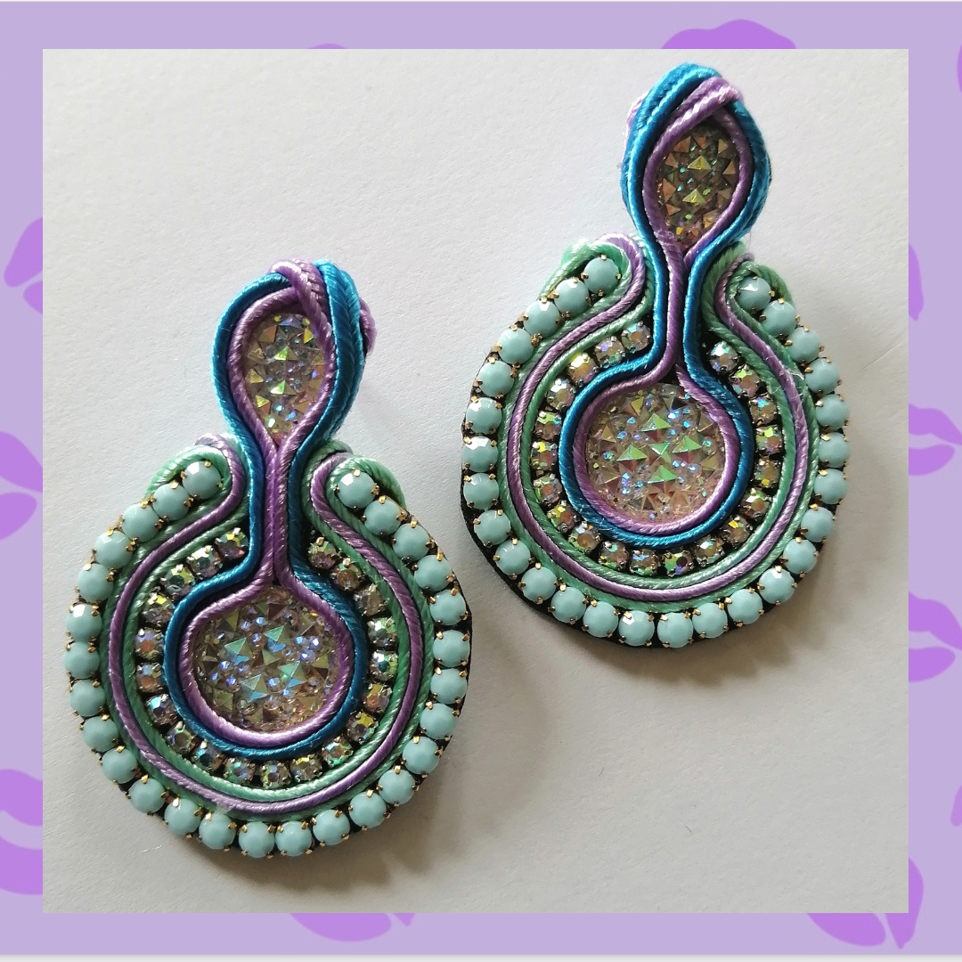 Aretes en Soutache lavanda, verde menta y azul eléctrico con Estrass azul celeste e iridiscente y piedras acrílicas tornasol. Super livianos.
