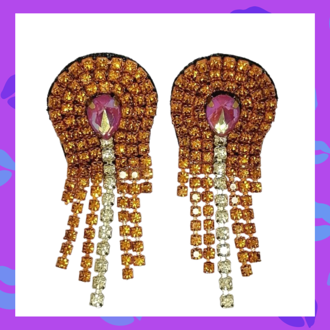 Aretes en Piedra de cristal y Estrass en tonos dorado, naranja brillante y rosa. Super livianos.