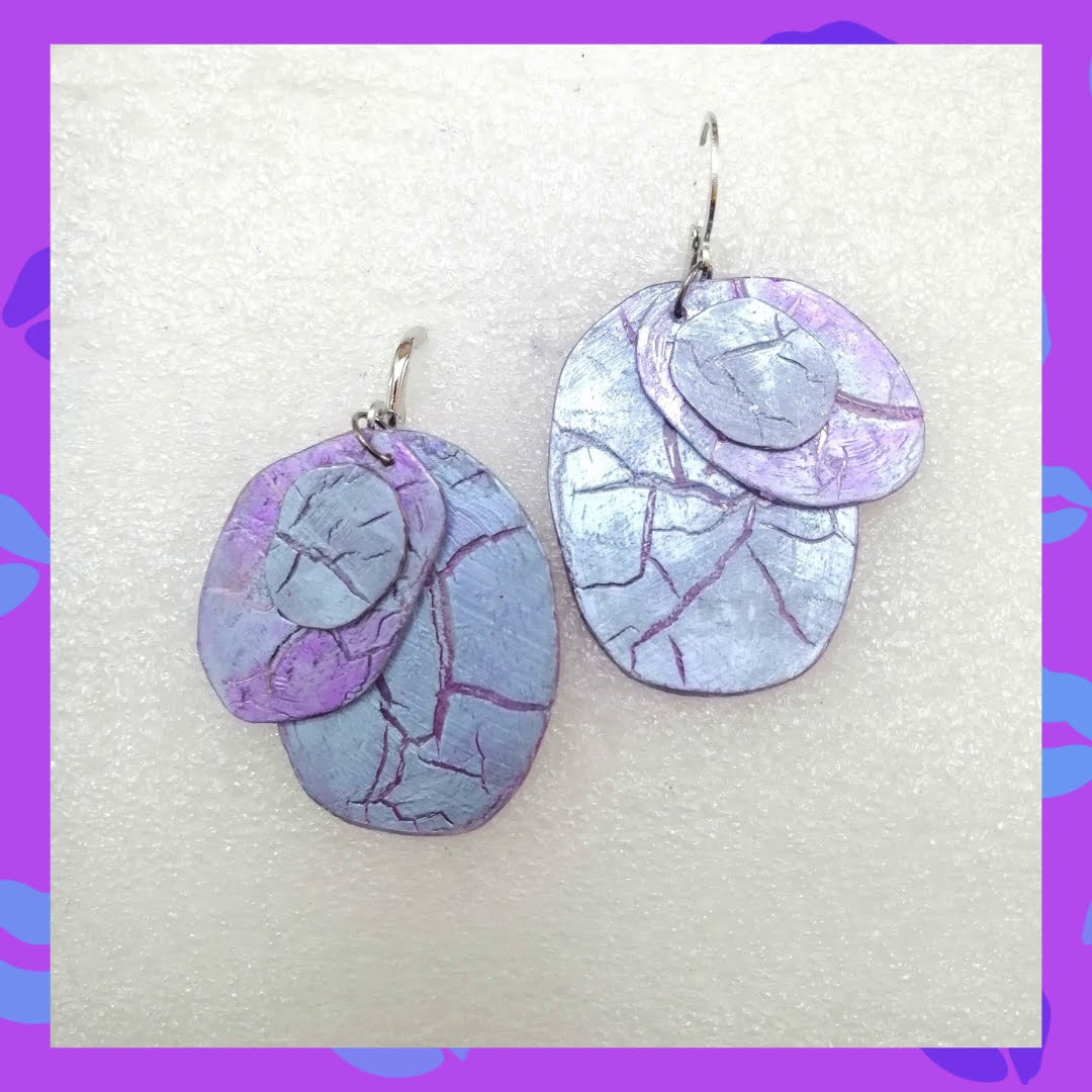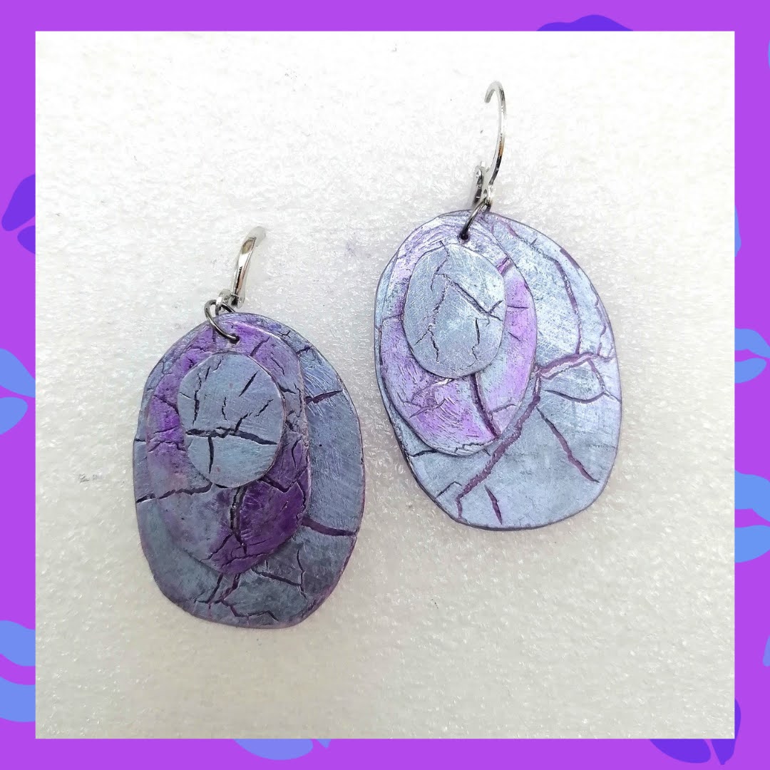 Aretes en tonos lila y púrpura elaborados a partir de CDs reciclados tratados en horno. Super livianos.