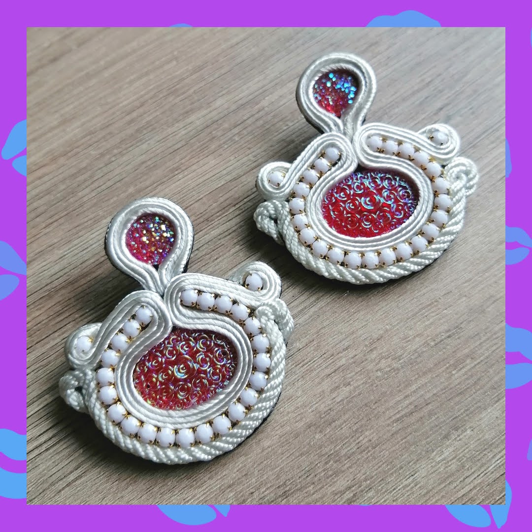 Aretes de poste en Acero inoxidable en Soutache y Cordón blanco con Strass blanco y Piedra acrílica de color rojo. Super livianos