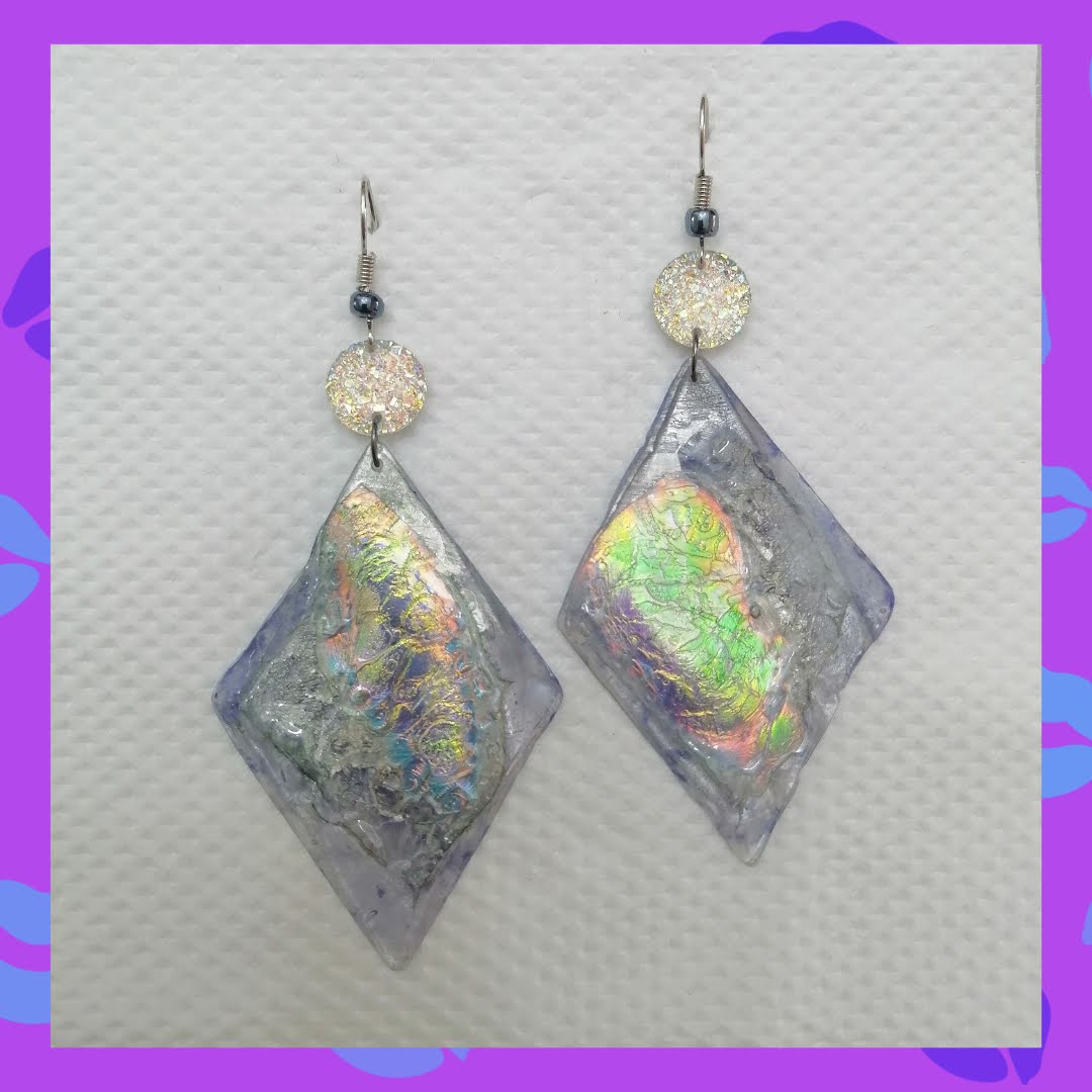 Aretes en tonos plata y tornasol, elaborados a partir de CDs reciclados tratados en horno. Super livianos.