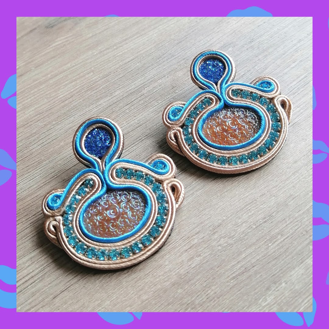 Aretes de poste en Acero inoxidable en Soutache azul eléctrico y dorado con Strass azul brillante y Piedras acrílicas ocre tornasol