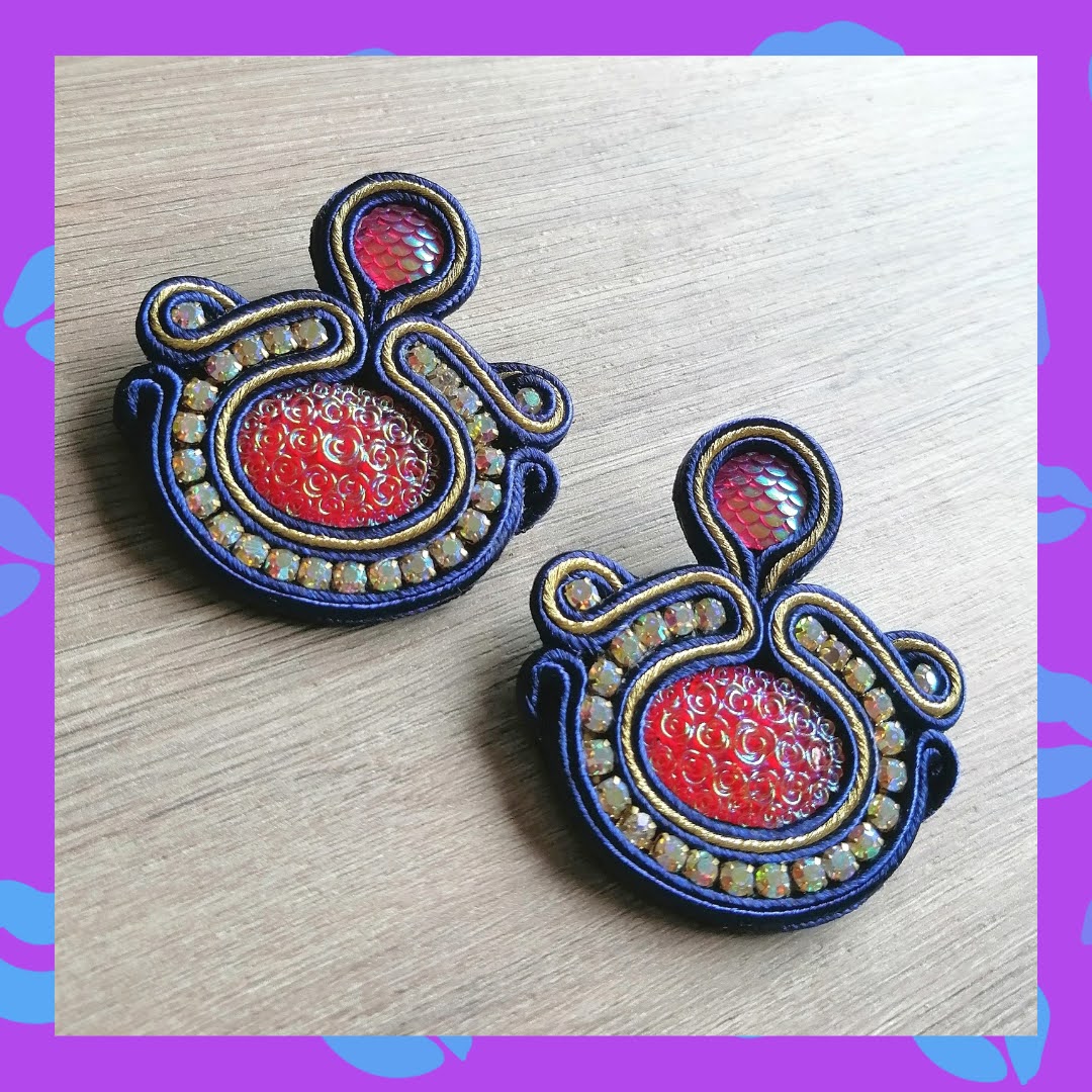 Aretes de poste en Acero inoxidable en Soutache azul oscuro y dorado con Strass dorado tornasol y Piedras acrílicas en rojo tornasol.