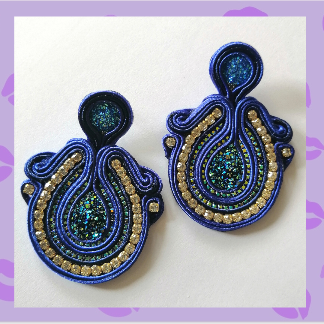 Aretes en Soutache azul real con Estrass dorado y drusas azul tornasol. Super livianos.