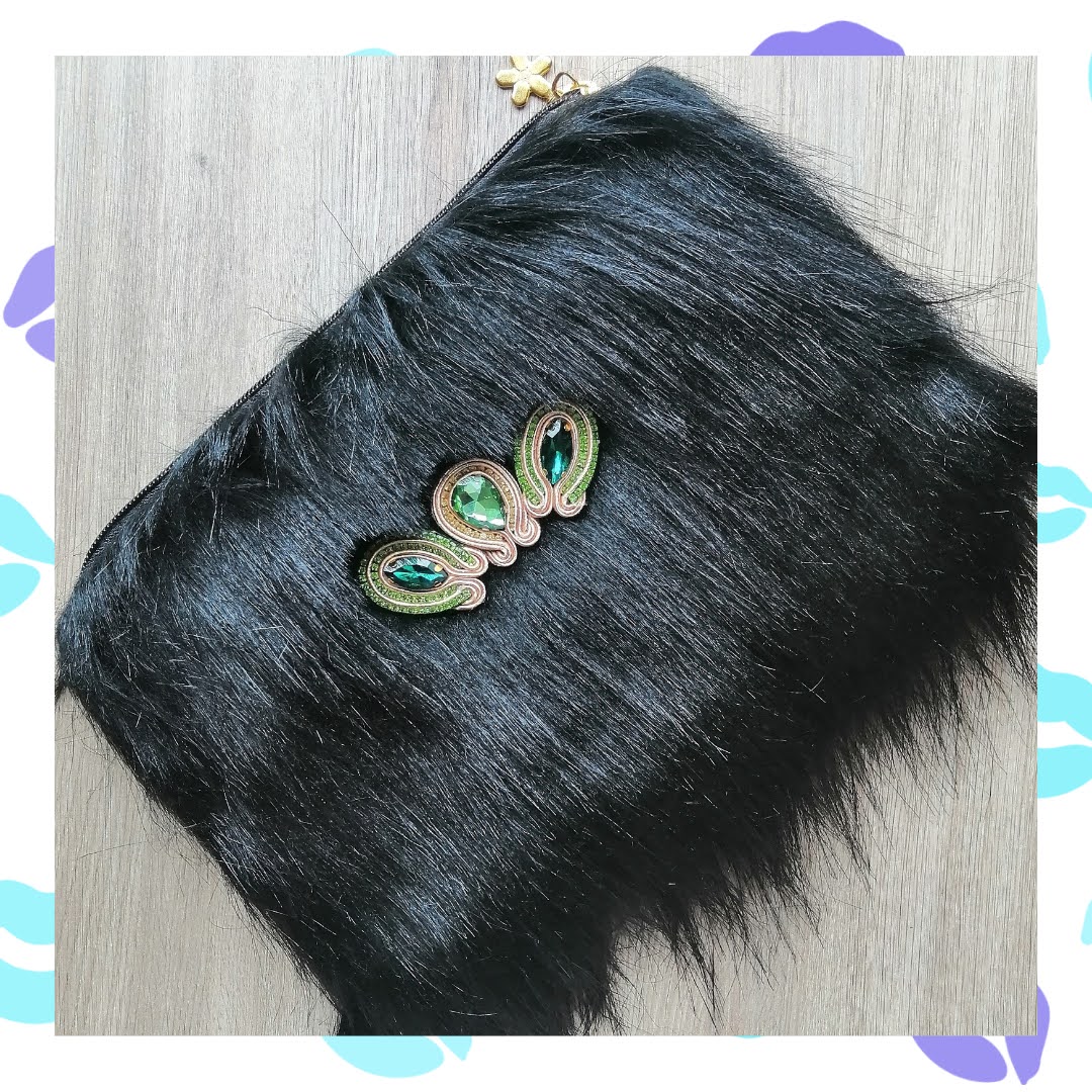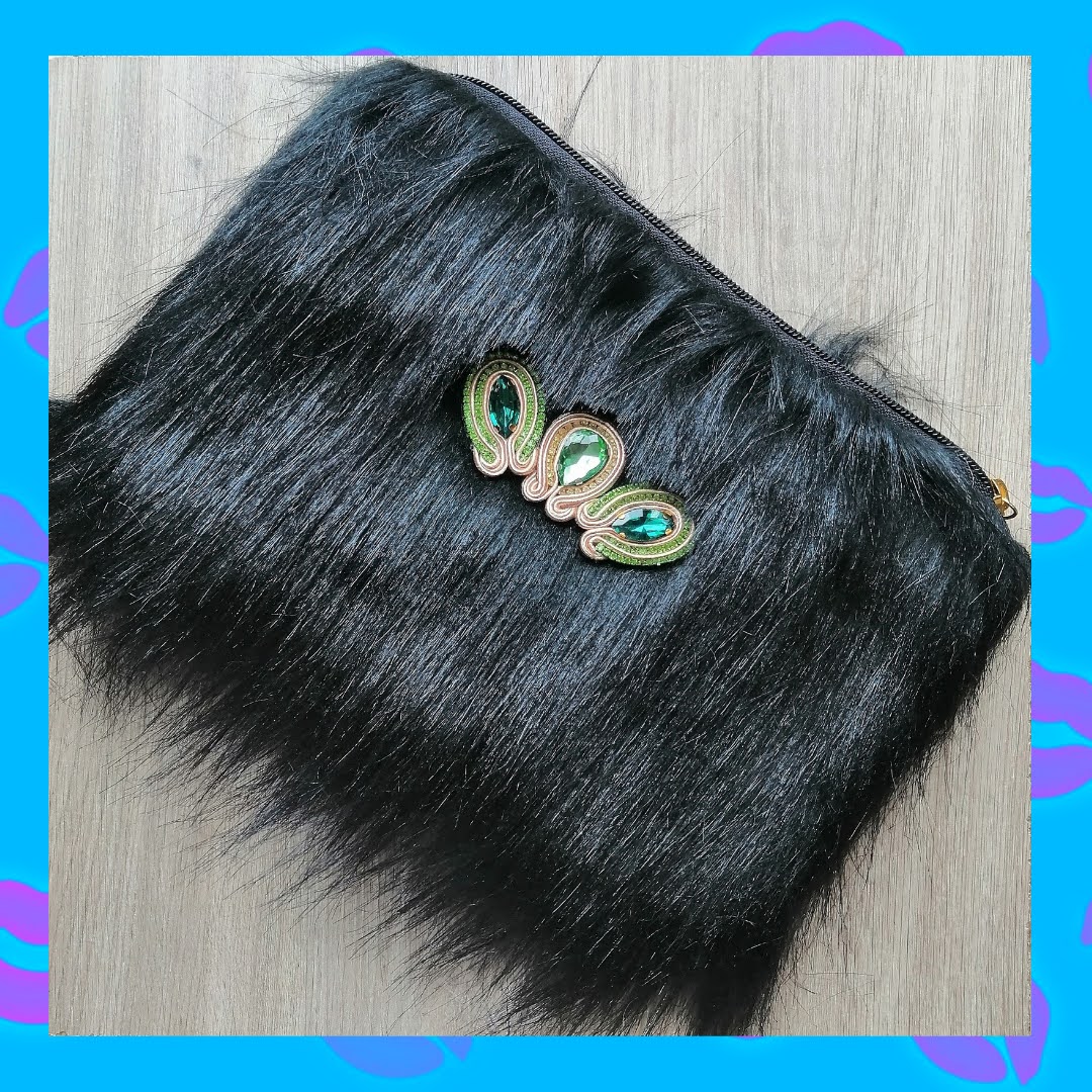 Cartera tipo Clutch en Peluche negro con Aplique en Soutache beige, Estrass dorado y Piedra verde esmeralda.