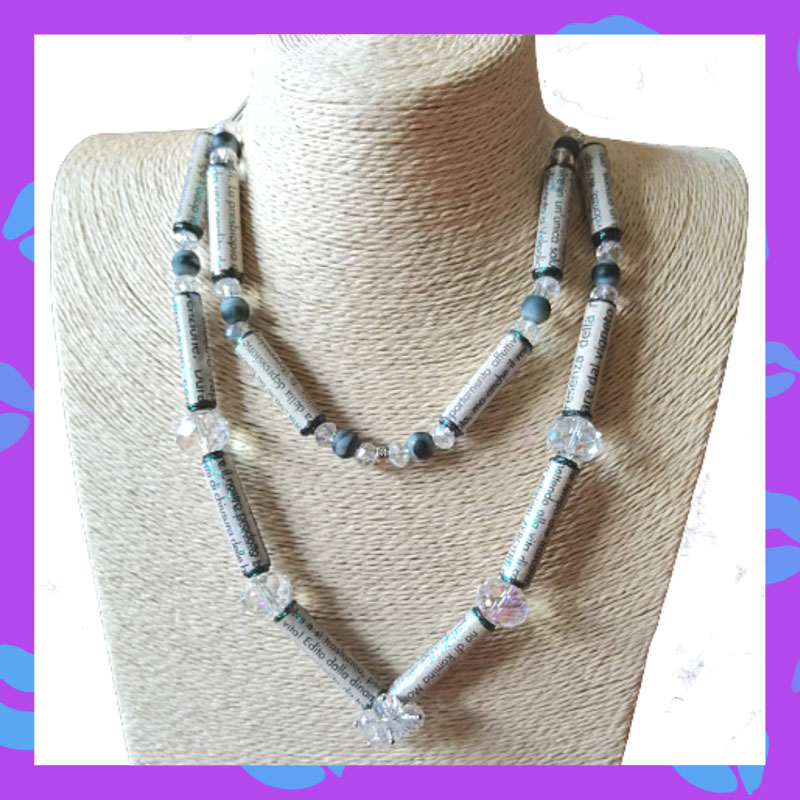 Collar en Gemas de Papel periódico reciclado y Rondelas con cierre en Acero Inoxidable