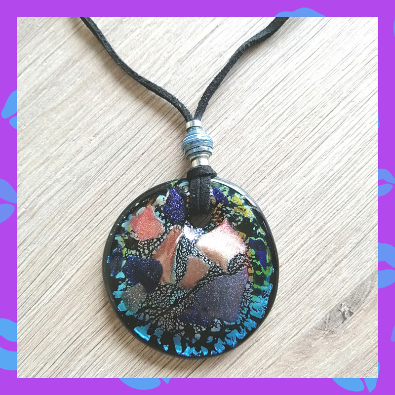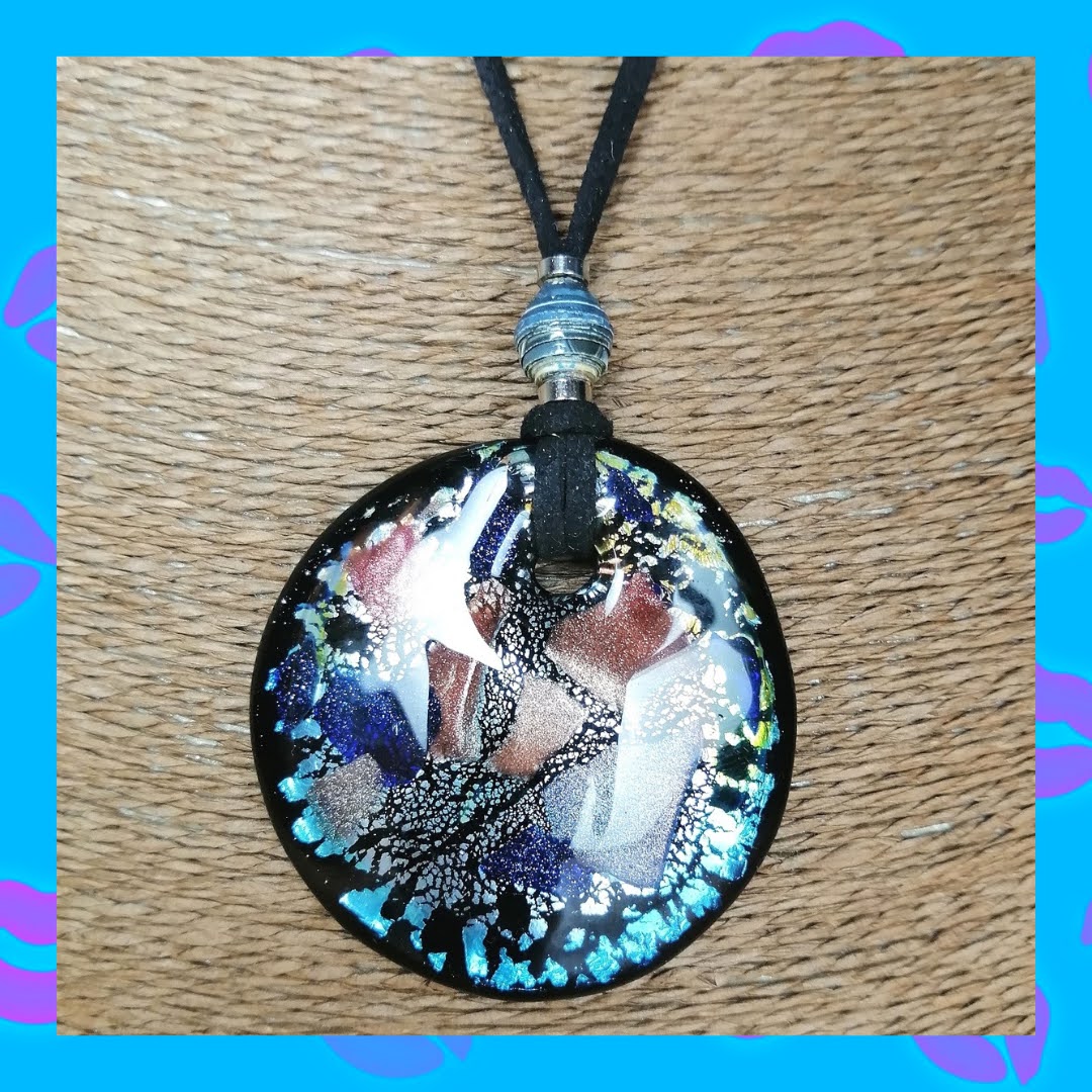 Dije en cristal Murano italiano en tonos púrpura, rosa y azul” con Gema de papel reciclado. Colgante de Cuero y cierre en Acero inoxidable.