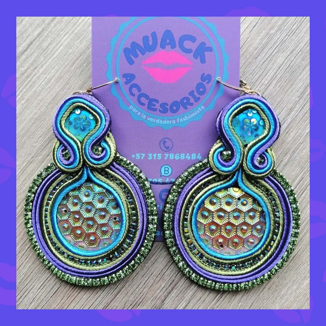 Aretes en Soutache púrpura, verde oliva y azul aguamarina con Strass verde oliva brillante y Gancho español dorado.