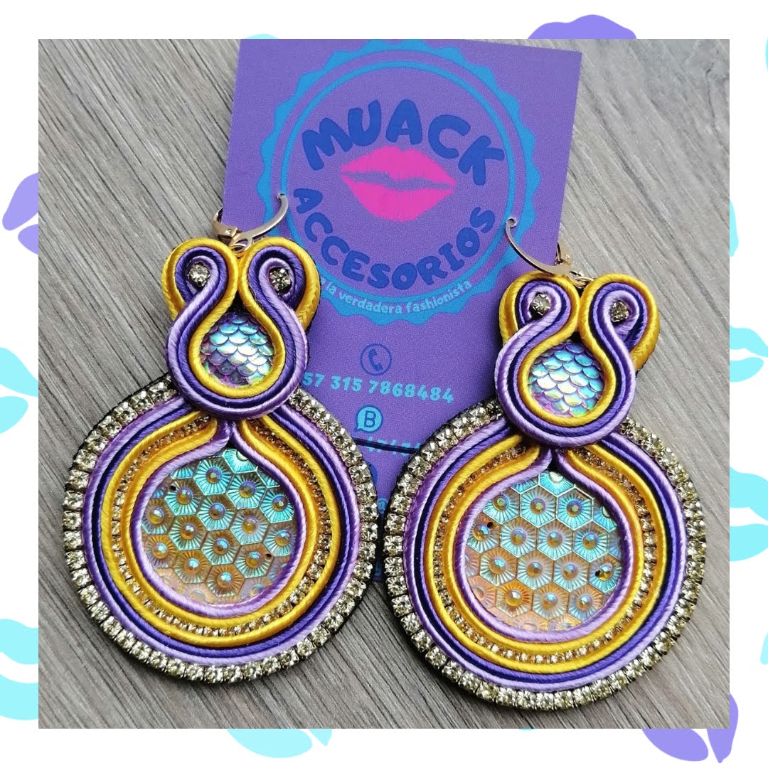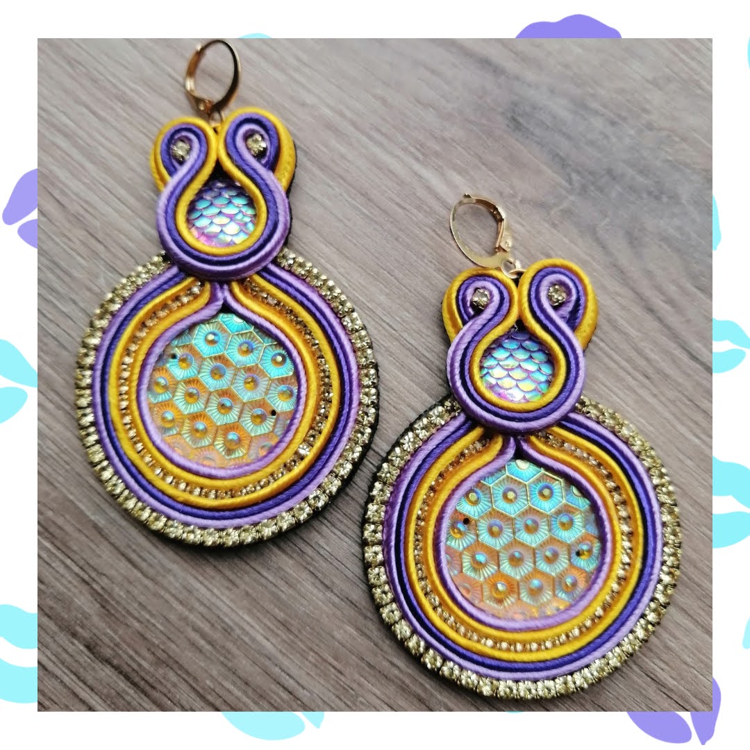 Aretes en Soutache lavanda, púrpura y amarillo eléctrico con Strass dorado y Gancho español dorado.