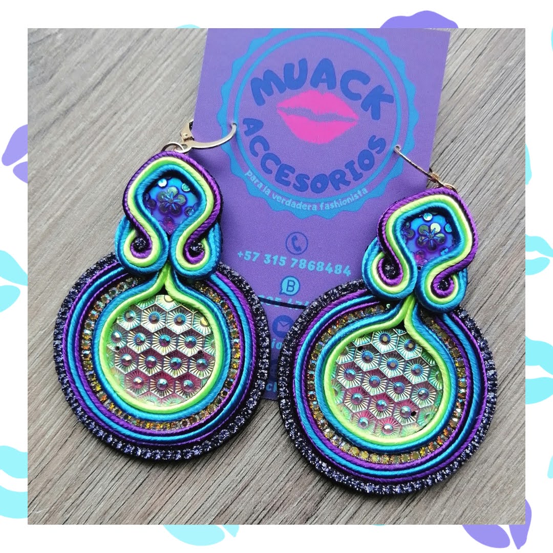 Aretes en Soutache púrpura, verde neón y azul aguamarina con Strass púrpura brillante y Gancho español dorado.