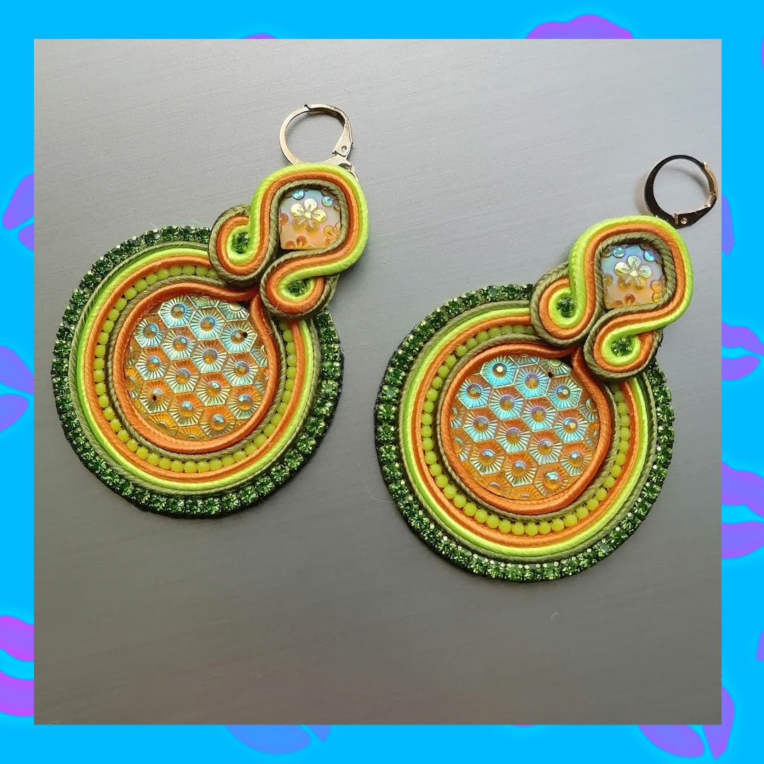 Aretes en Soutache verde oliva, verde neón y naranja eléctrico con Strass verde oliva y neón y Gancho español dorado.
