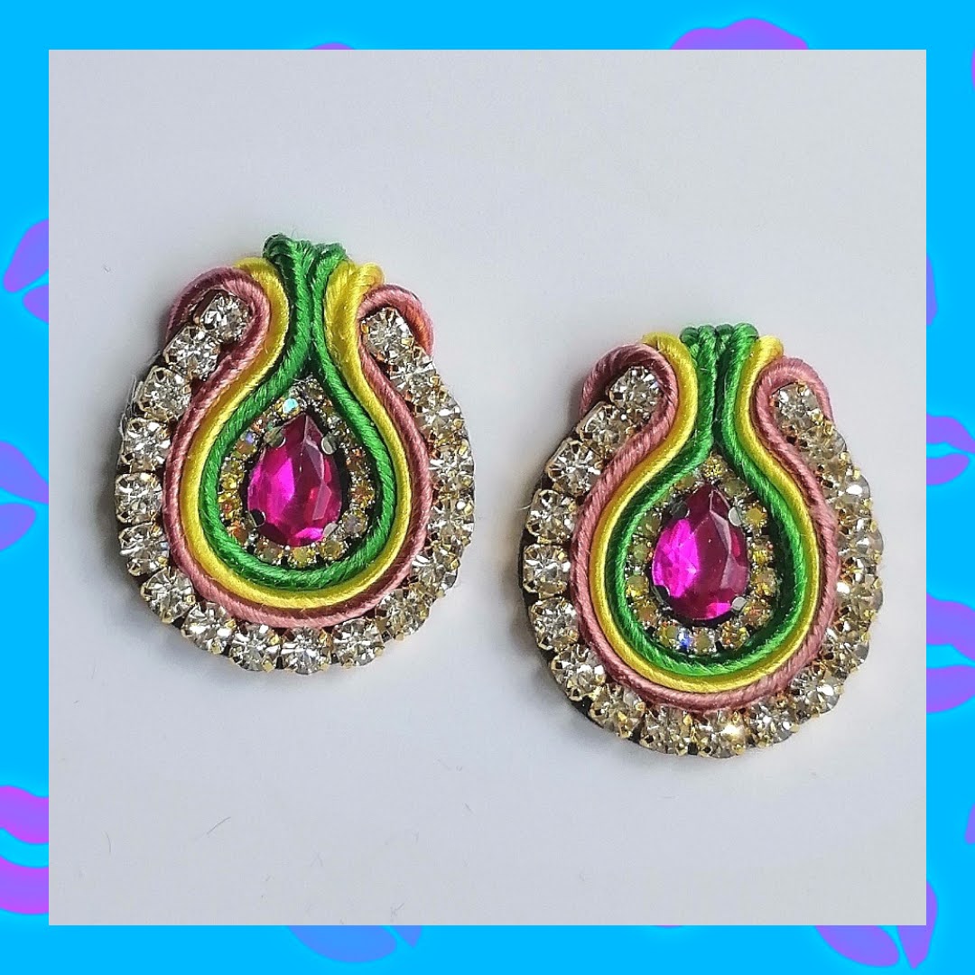 Aretes de poste en Acero inoxidable en Soutache palo de rosa, amarillo y verde esmeralda con Strass dorado tornasol y dorado y Piedra fucsia brillante