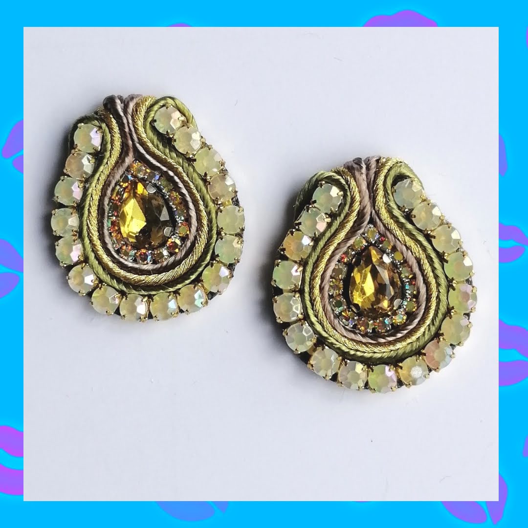 Aretes de poste en Acero inoxidable en Soutache verde oliva, dorado y ocre con Strass dorado tornasol y verde tornasol con Piedra ocre brillante