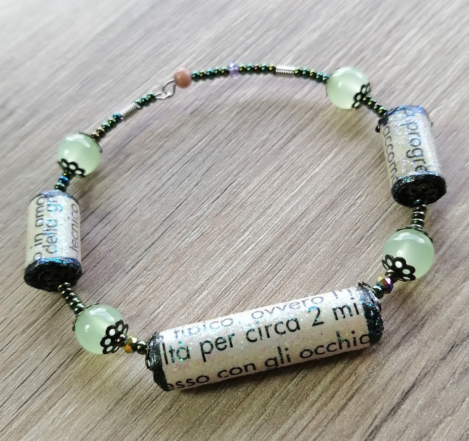 Pulsera de una vuelta en Acero inoxidable, Gemas de Papel Periódico reciclado, cuentas de vidrio chino y checas. Verde. Talla S/M.