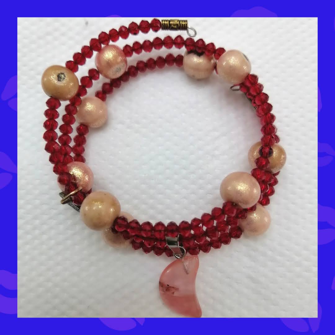 Pulsera de tres vueltas en Acero inoxidable con Murano chino rojo escarlata, Tagua y Medialuna en cristal rosa y herrajes en Acero inoxidable