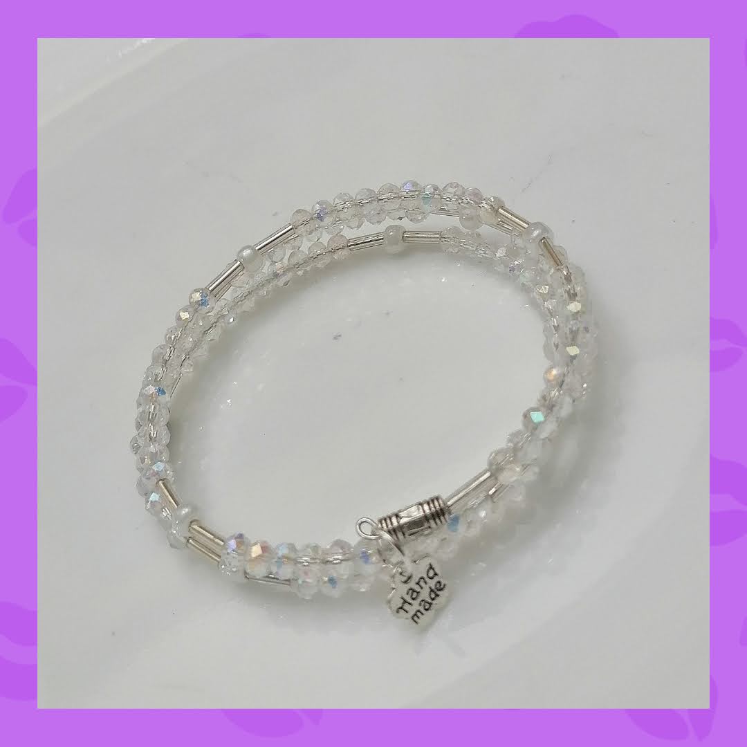 Pulsera de tres vueltas en Acero inoxidable con Murano chino transparente tornasol, Piedras perladas, Mostacillas transparentes y Dije “Handmade”